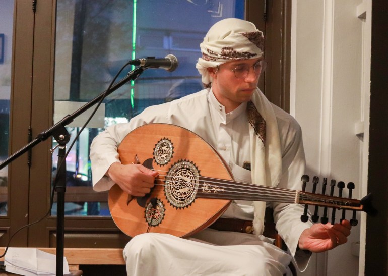 Rami est membre du duo Tihamah Ensemble, qui joue de la musique traditionnelle du Yémen et du Hijaz, la région à l’ouest de la péninsule arabique. Ce soir, il joue seul de l’oud (instrument à cordes pratiqué dans le monde arabe notamment), car son partenaire percussionniste est très occupé et ne peut participer avant quelques semaines.