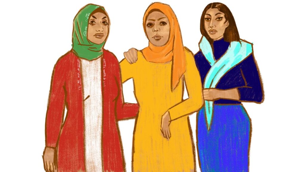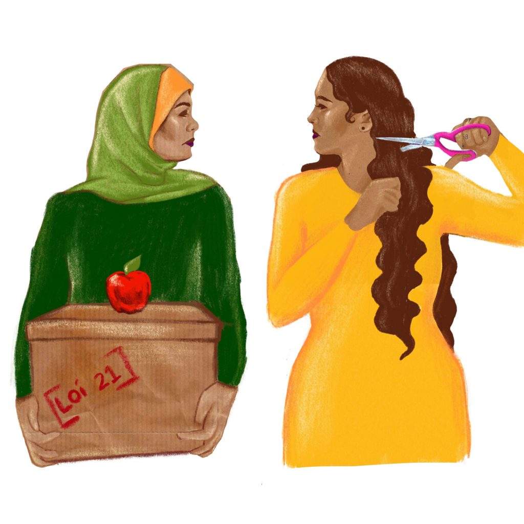 Cette illustration représente la solidarité entre les femmes qui en ont assez de ne pas avoir le choix de leur corps et de leur voix au Québec comme en Iran. Illustration: Nia E-K